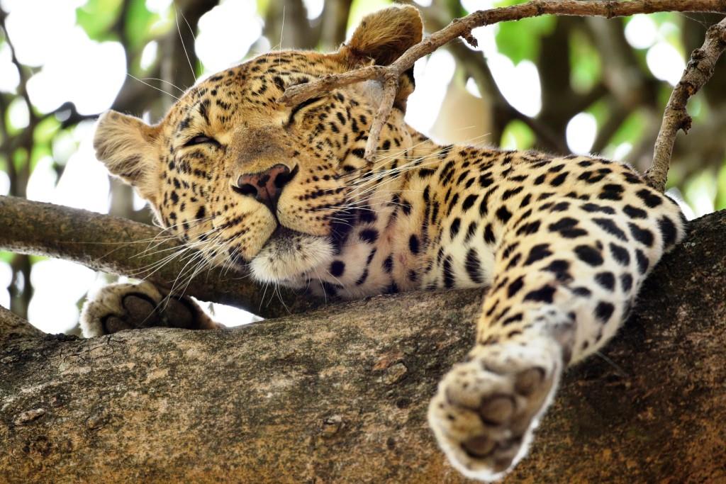 We left the area only to see hyenas prowling around about a mile away. Knowing their great sense of smell, we thought that they might smell an aardvark dinner awaiting them, so we went back to the kill site and sure enough they arrived shortly thereafter. So, the leopard just climbed the tree and watched as the hyenas got frustrated with their inability to get up there as well. They were quite excited, she was rather bored with it all and mad about the sleep interruption.