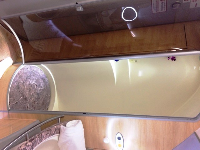 Below are two shots of the shower room that Emirates gets much publicity about. It was about 5′ x 15′ in size, serving as the toilet for most of the flight. For the shower experience, you reserve a 20 minute time slot and get 5 minutes worth of water to shower with. All sort of toiletries, hair dryer, and such are there to be used. Two staff people on hand just to clean up after each use.